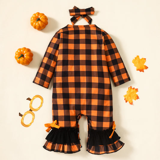 Plaid Ghost Graphic Round Neck Long Sleeve Jumpsuit