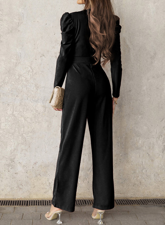 Belted Long Puff Sleeve V-Neck Jumpsuit