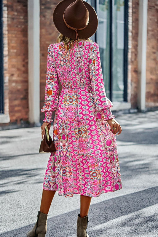 Smocked Round Neck Lantern Sleeve Midi Dress
