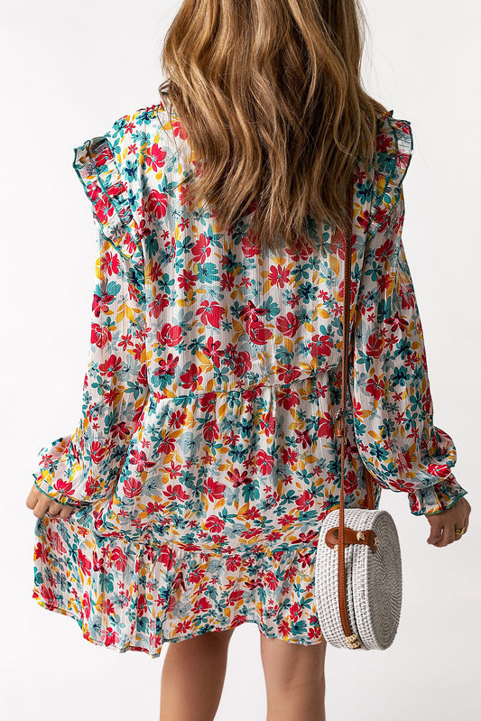 Floral Notched Neck Flounce Sleeve Shift Dress