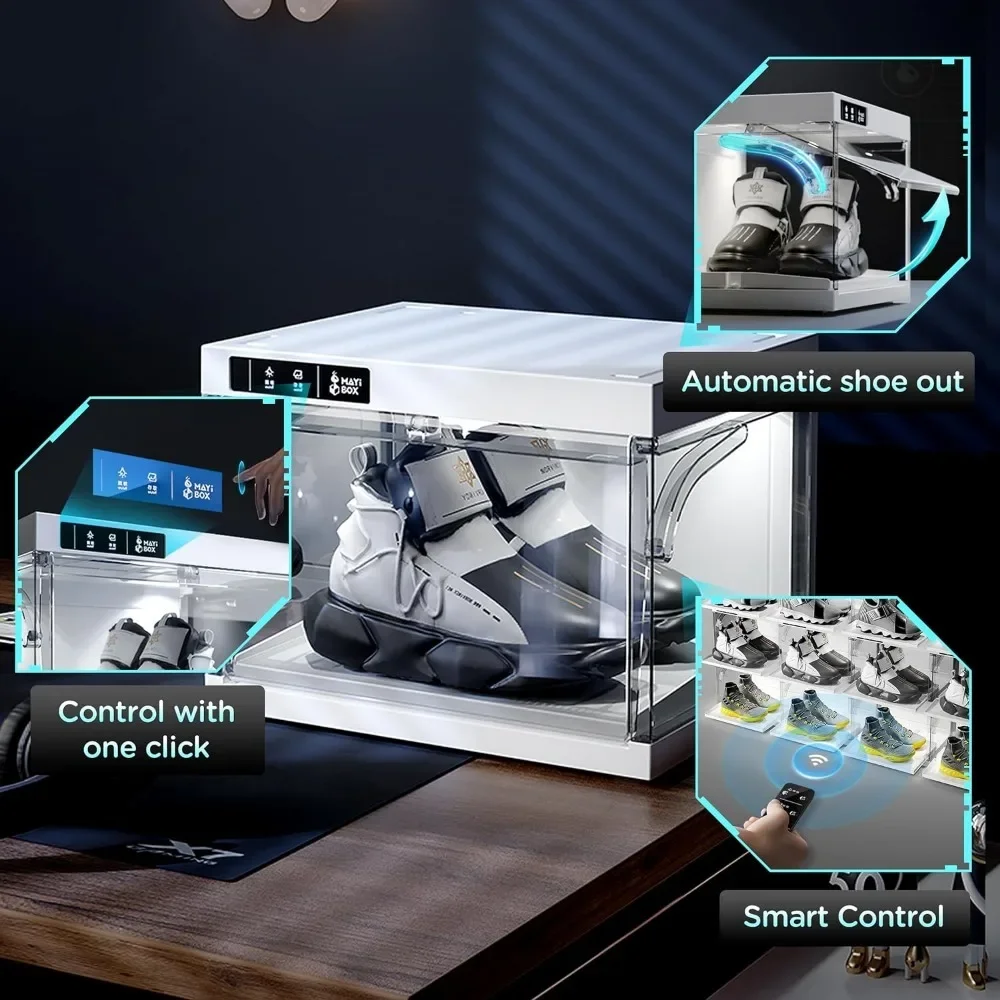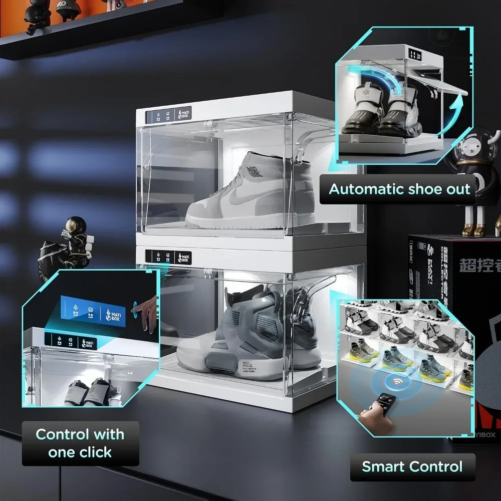 - Smart Control: The shoe display case comes with a remote control that controls the lights, opens the doors, and pushes/retracts boxes. Control single or multiple boxes with one click.