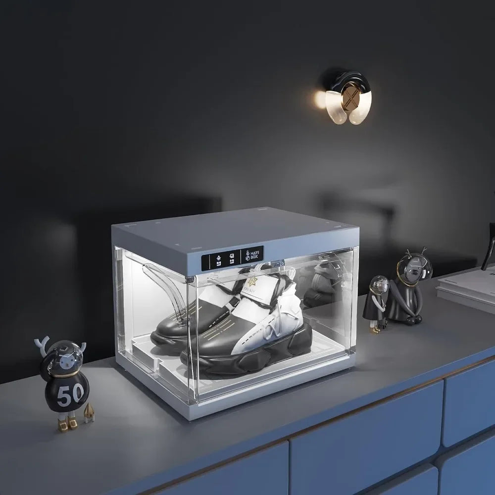 - Uses: The boxes have electric contacts on the bottom, making them easier to stack. This LED shoe display case serves as a great decoration that adds a high-tech feel to your living room, live room, collection room, or gaming room.