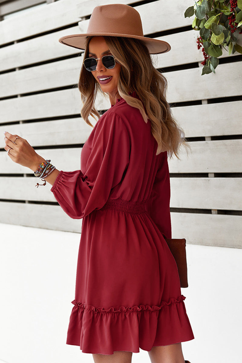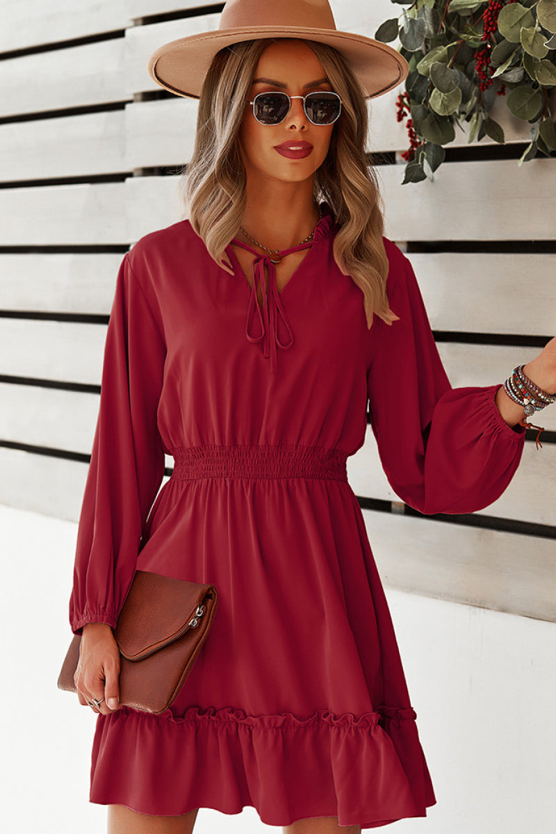 Tie Neck Smocked Waist Ruffle Hem Dress